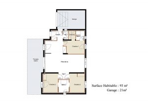Le plan intérieur de cette maison de plain-pied a été pensé de manière à offrir un cadre de vie harmonieux et fonctionnel. Du garage on accède au cellier jouxtant l’espace cuisine. Spacieuse, et très lumineuse, la pièce de vie est conviviale et chaleureuse. Depuis la cuisine aménagée les occupants profitent de la vue sur le jardin, accessible grâce aux baies vitrées. La maison possède également une suite parentale avec dressing et salle d’eau privative et à l’opposé deux chambres avec salle d’eau commune.